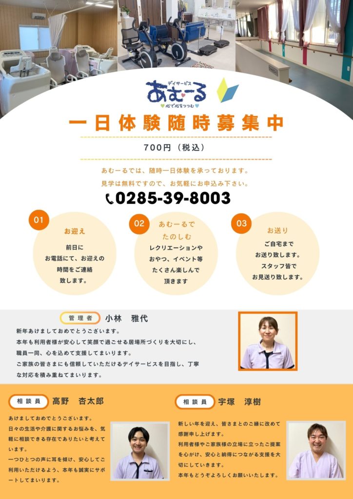 新しい一年がスタートしました。本年もデイサービスあむーるでは、笑顔とつながりを大切に、心と体が元気になる時間をお届けしてまいります。