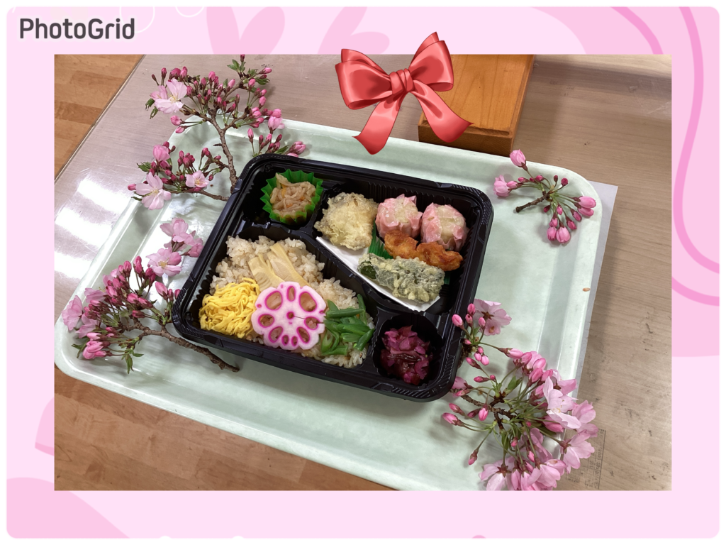 桜も終盤になりかけていますが施設内にいても🌸桜を感じて頂けるように、今日のランチはお花見弁当でした☺