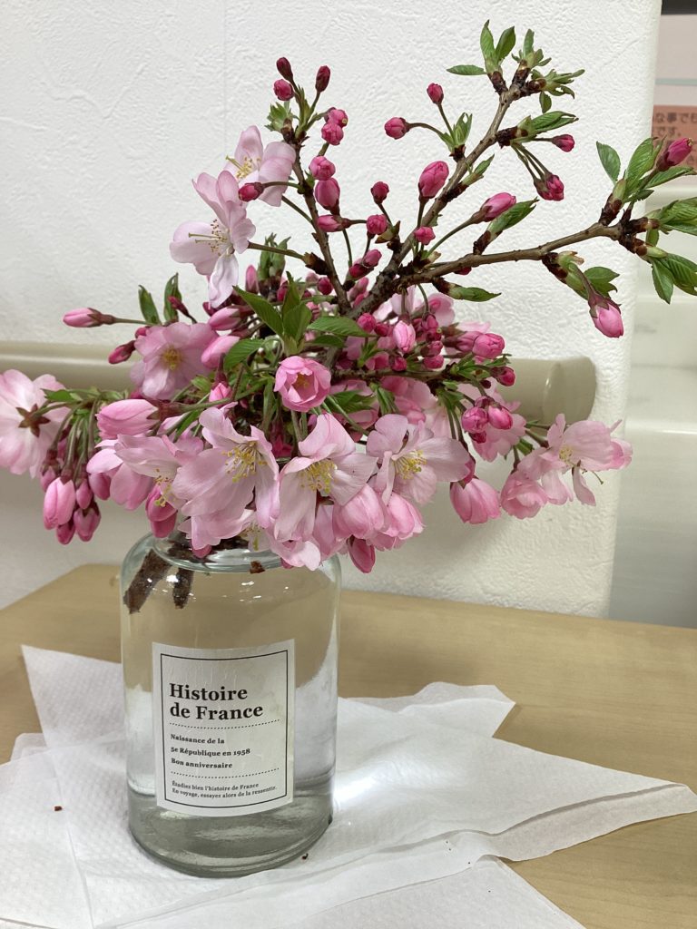 職員が家の庭から取ってきた桜を飾り、少しでも雰囲気を出してみました。